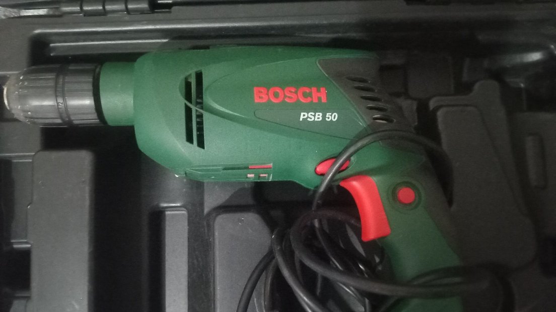 Bosch PSB 50 elektrikli matkap, yeşil gövde ve kırmızı detaylara sahip, kablolu güç bağlantısı içerir. ⚙️