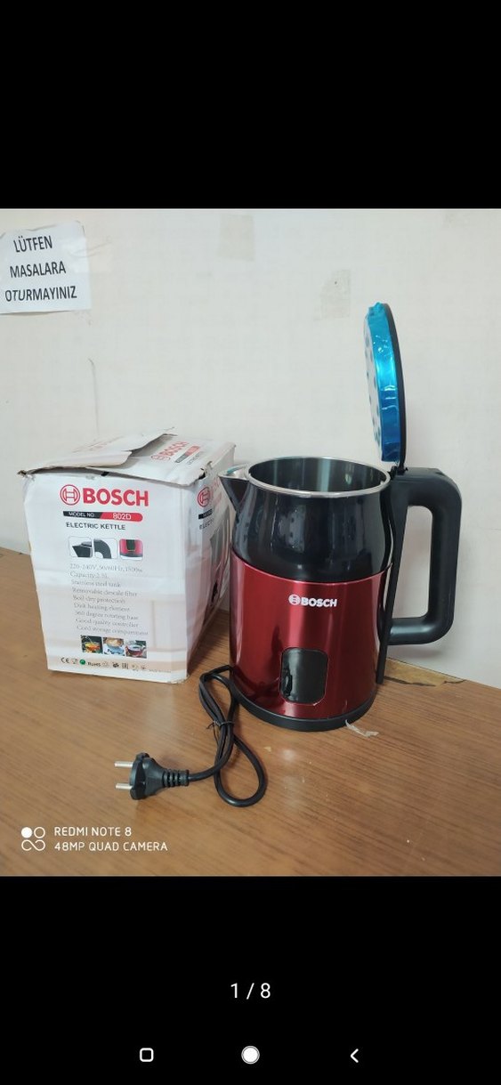 Saplı ve kapaklı, renkli bordo Bosch elektrikli su ısıtıcısı. Hızlı su kaynatma için uygun, orijinal kutusuyla birlikte. ☕1500watt