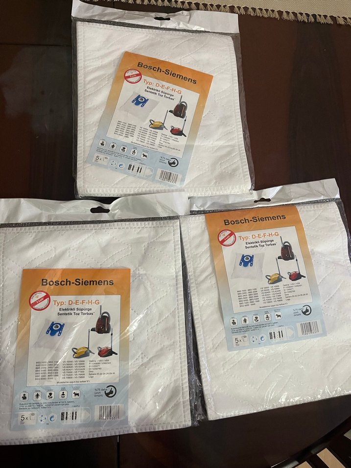 Bosch-Siemens marka, çeşitli modellere uyumlu beyaz ve gri renkli elektrikli süpürge toz torbaları, 3'lü paket. Her birinin içinde 5 adet var fiyat tep paket fiyatıdır
