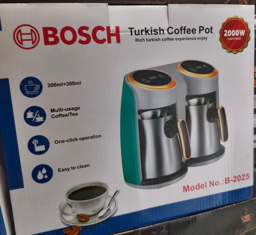Bosch kahve makinesi, çift paslanmaz çelik demlik ve kahve ile süt ayarları için dijital ekranlar içerir. Siyah renk ile şık ve kullanışlıdır. ☕
