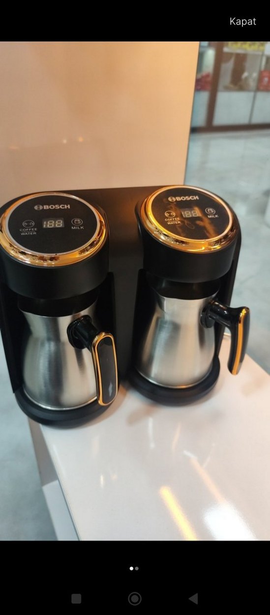 Bosch kahve makinesi, çift paslanmaz çelik sürahi ve su ile süt ayarları için dijital ekran içerir. Şık siyah tasarımı modern bir dokunuş sağlar. ☕