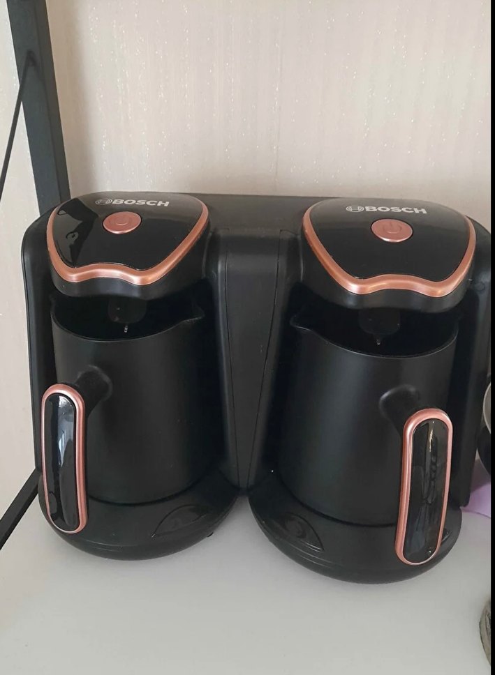 Bosch siyah kahve makinesi, çift demleme ünitesi ve bakır detaylarla iki fincan kahve hazırlamaya uygundur. ☕