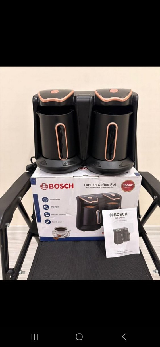 yurt dışı ürünüdür BOSCH Türk Kahve Makinesi, çift karaflı ve siyah renkte olup 2000W güçle kahve yapar. Kutusu ve kullanım kılavuzu dahildir. ☕