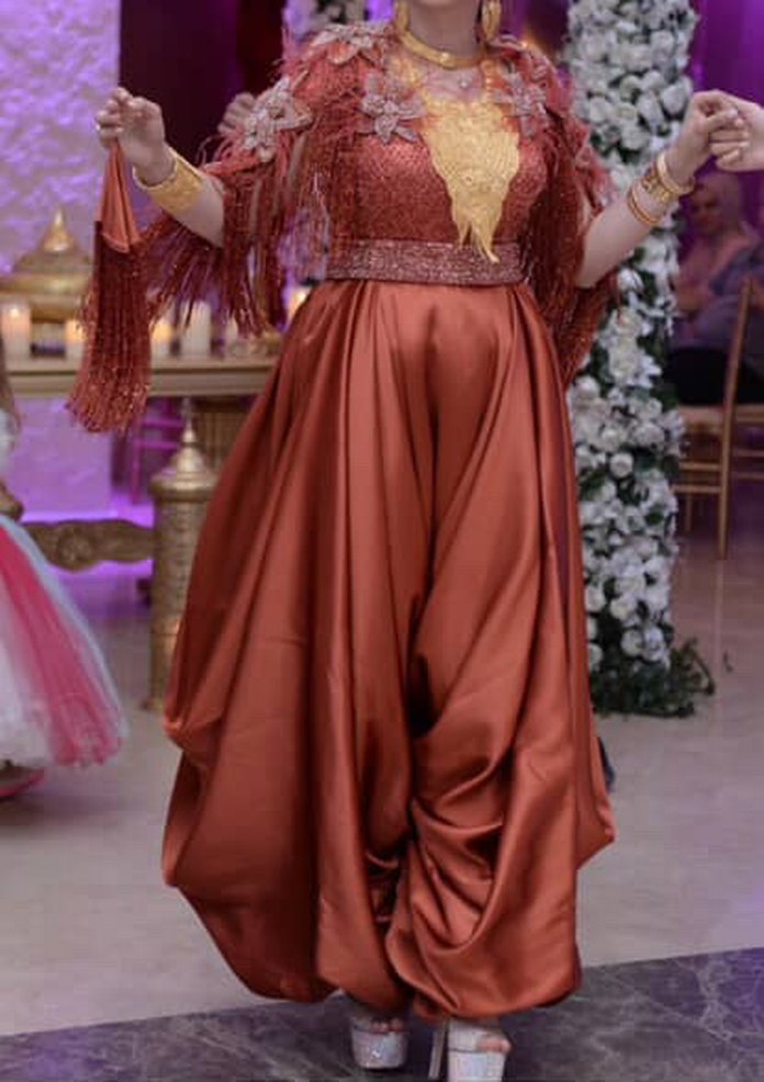 Tasarım boşnak şalvarı parlak kumaştan yapılmış, drapeli ve bol kesim kına elbisesidir. Uzun kollu, V yakalı ve işlemelidir, düğünler için uygundur.