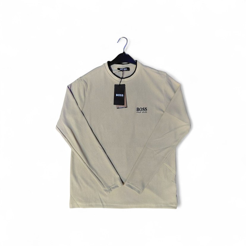 Bej renkli, uzun kollu, yuvarlak yakalı, bol kesim sweatshirt. BOSS baskılı, yumuşak ve sıcak kumaştan, günlük rahat sokak stili için uygundur.
