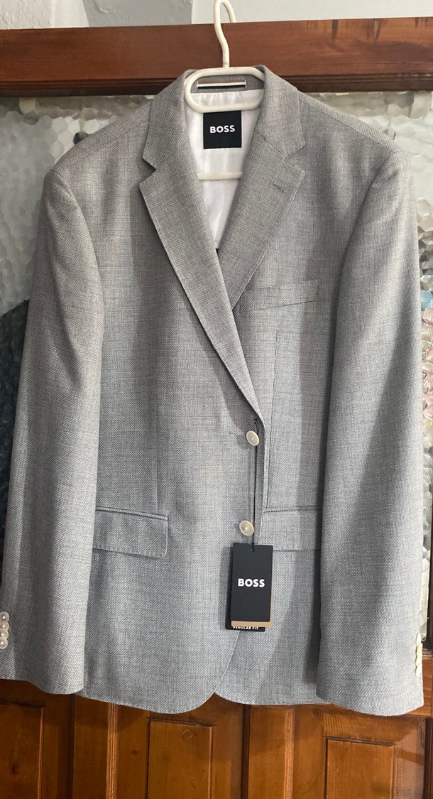 BOSS marka gri renkli, düğmeli, normal boy erkek takım ceketi. Klasik kesim, uzun kollu, ofis için uygun şık tasarım.
