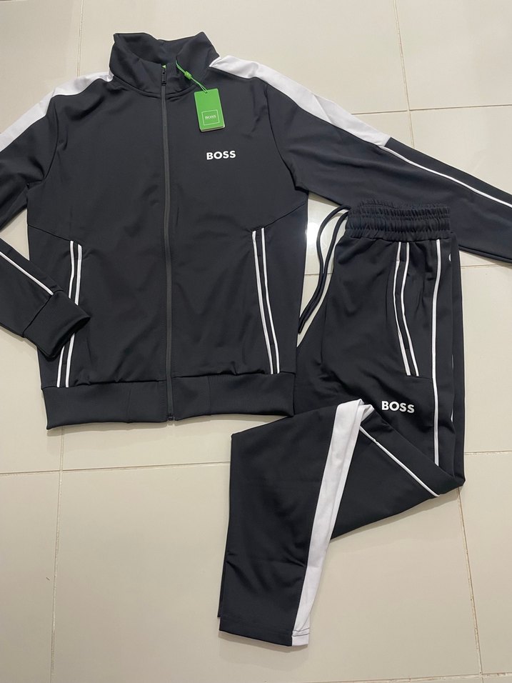 BOSS markalı eşofman takımı, regular fit, bisiklet yaka ve uzun kolludur. Fermuarlı detaylara ve antrasit renk baskılı desene sahiptir.