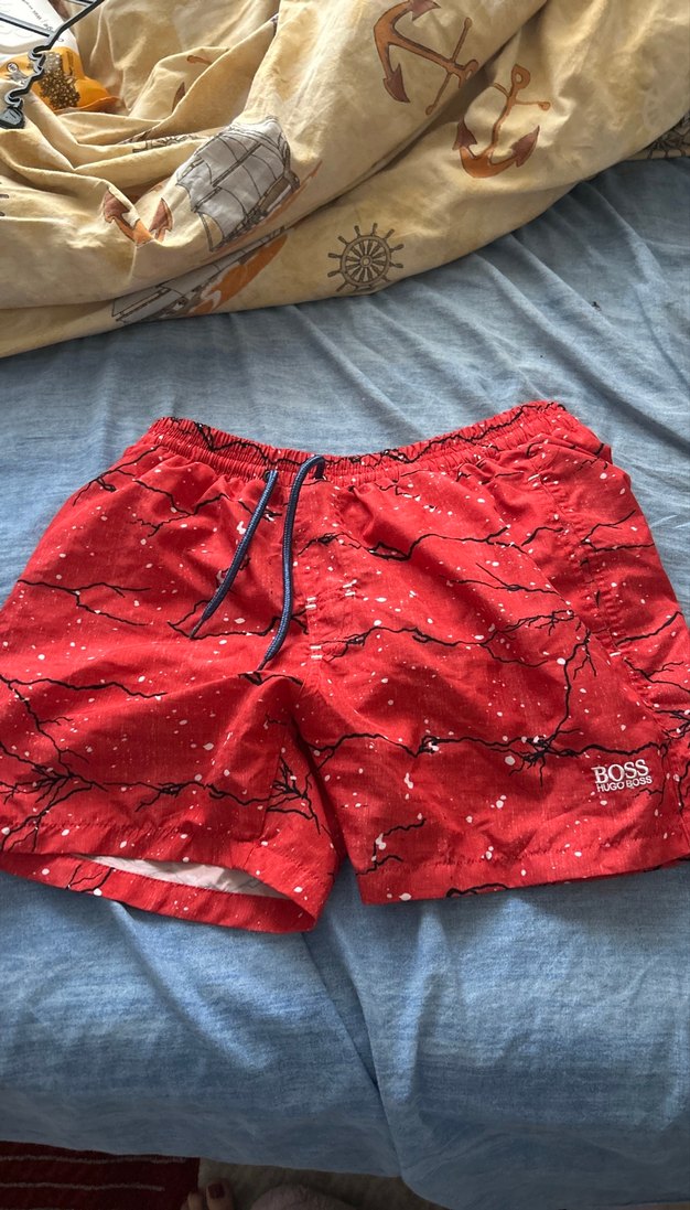 BOSS marka kırmızı mini erkek deniz şortu, bol kesim ve düğmeli detaylara sahip, renkli ve desensiz tasarımıyla plaj için uygun.
