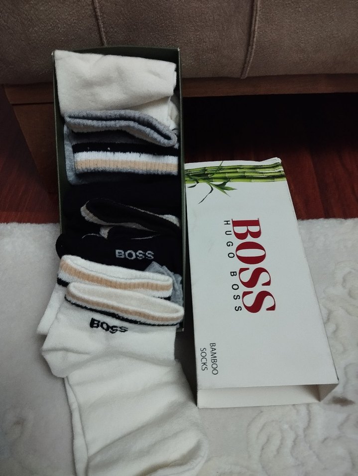 BOSS markalı, bambu kumaştan üretilmiş beyaz ve gri siyah renkli, normal uzunlukta, fitted erkek çorap seti. Kutuda 6 çift bulunur.