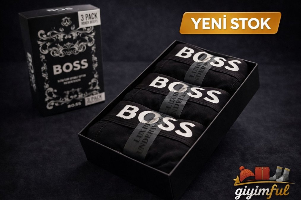 BOSS baskılı siyah, normal uzunlukta, vücuda oturan erkek boxer 3'lü paket. İş tarzına uygun midi boyda, m beden.