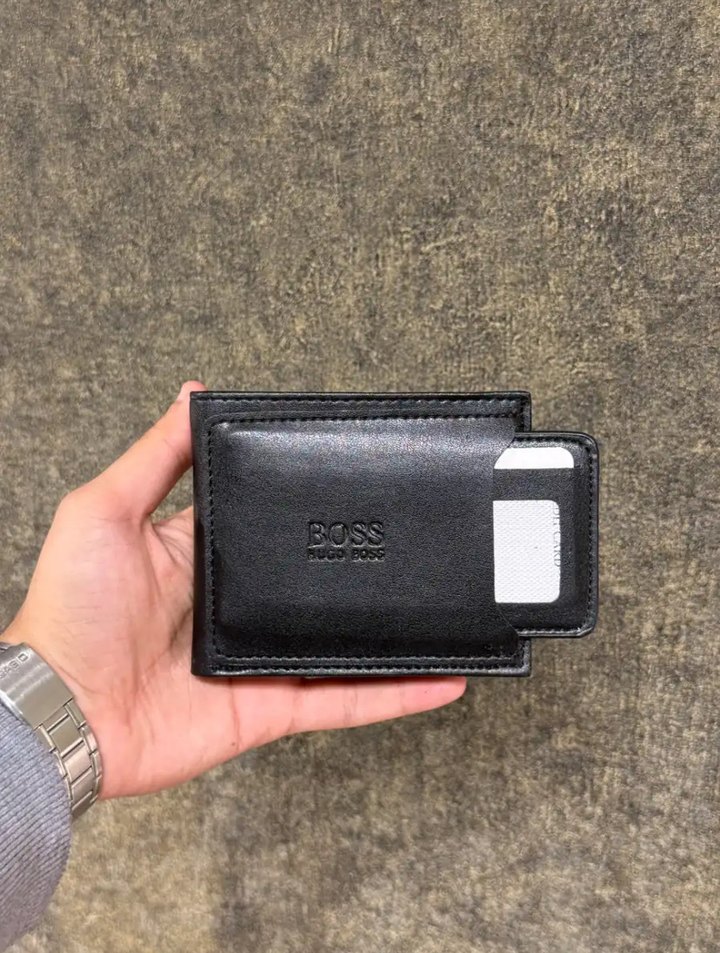 Baskılı BOSS logosu ve kart bölmesi olan siyah erkek cüzdan, trend sokak stiline uygun.