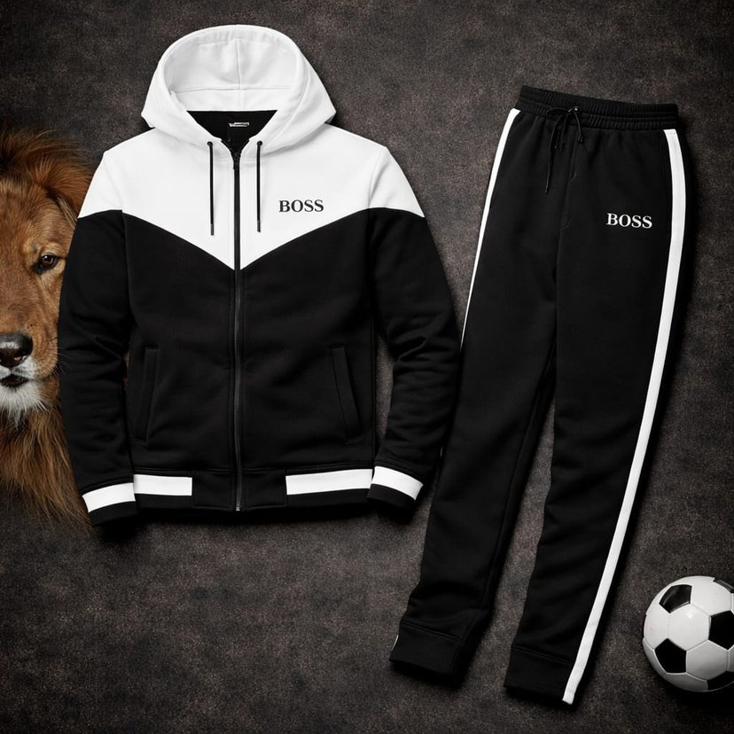 BOSS marka, fermuarlı, bisiklet yaka uzun kollu üst ve eşofman altından oluşan siyah-beyaz renkli, rahat kesim eşofman takımı. Yumuşak ve sıcak kumaştan üretilmiştir.