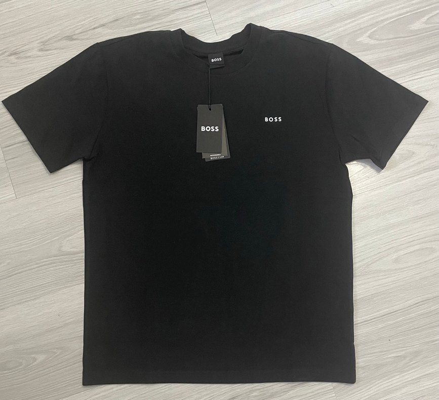 BOSS marka siyah erkek tişört, kısa kollu ve yuvarlak yaka, bol kesim ve minimalist baskılı tasarıma sahip. Günlük kullanım için rahat.