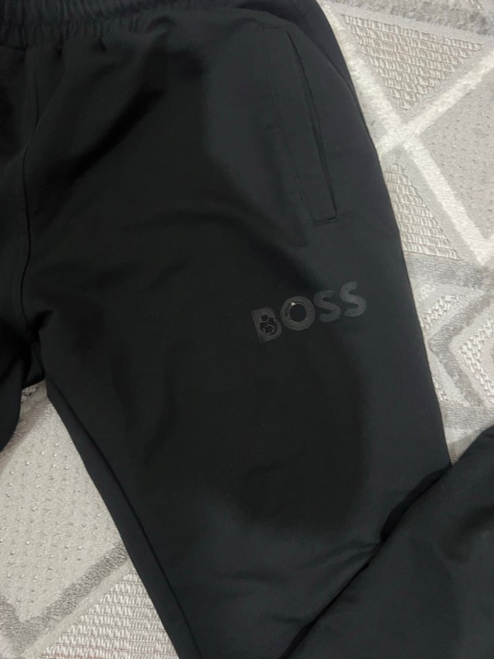 BOSS baskılı, fermuarlı cepli, sentetik kumaştan yapılmış siyah, normal boyda, erkek eşofman altı. Trendy ve rahat bir görünüm sunar. ️