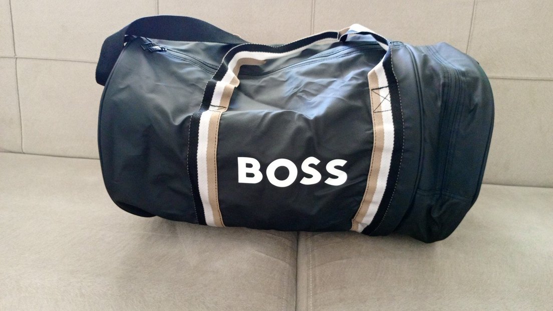 Siyah ve gri renkte, kemerli ve baskılı BOSS logosu bulunan erkek spor çantası, trend sokak stili için uygundur.