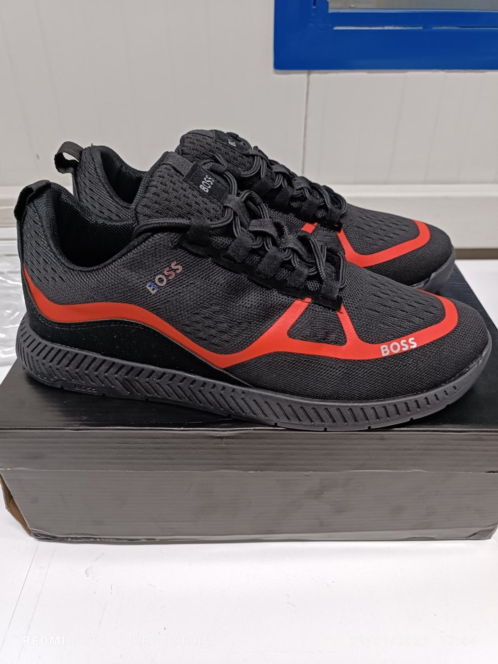 BOSS erkek spor ayakkabısı, siyah ve kırmızı renklerde, bağcıklı ve kauçuk tabanlı, sportif ve günlük sokak tarzına uygun. Arkadaşlar ayakkabı orjinal üründür ve sıfırdır..