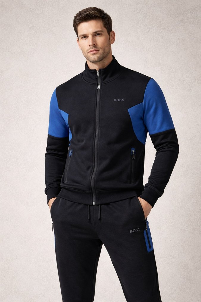 BOSS marka, lacivert ve mavi renklerde, fermuarlı cepleriyle rahat spor eşofman takımı. Uzun kollu, pamuklu yumuşak kumaştan, günlük ve spor tarzına uygun.