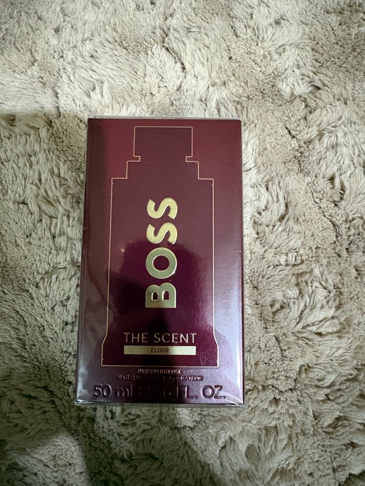 BOSS The Scent, parlak bordo şişede modern klasik erkek parfümüdür ve iş stiline uygundur. Ambalajda 'THE SCENT' yazısı yer alır.