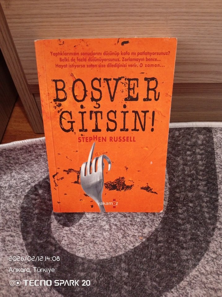 Stephen Russell'ın "Boşver Gitsin!" adlı romanı, hayatın zorlukları ve seçimleri üzerine odaklanıyor. Turuncu kapakta yukarı uzanan bir el görünüyor.
