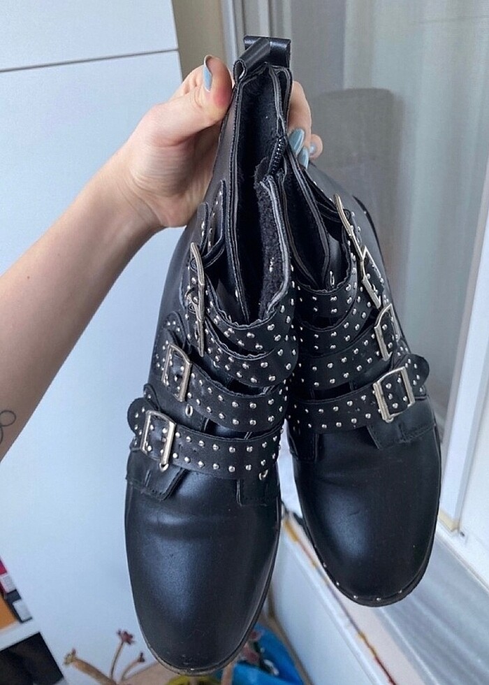 Siyah bot. Temizleyip göndereceğim. Birkaç kez kullanıldığı için iç tabanda ufak hasarlar mevcut. Yurt dışından almıştım. 40 numara olmasına aldanmayın ben 38-39 giyen ince&kemikli ayaklı biri olarak rahatça giydim. Tarz bir bot.