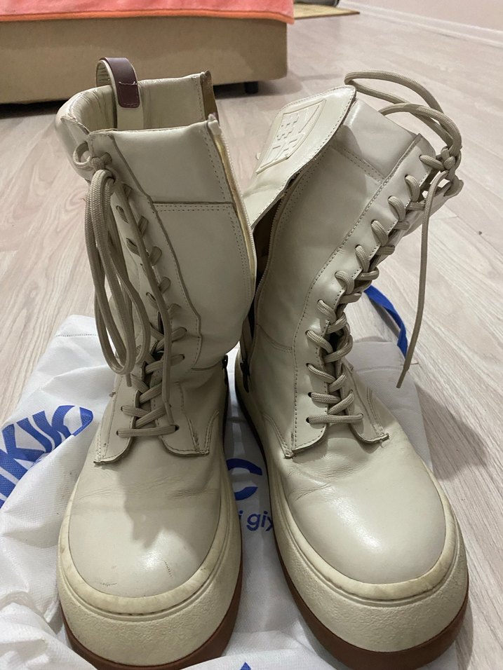 Beyaz deri, bağcıklı ve dolgu topuklu bu botlar sokak stiline uygun, günlük kullanıma rahat ve şık bir dokunuş katıyor.
