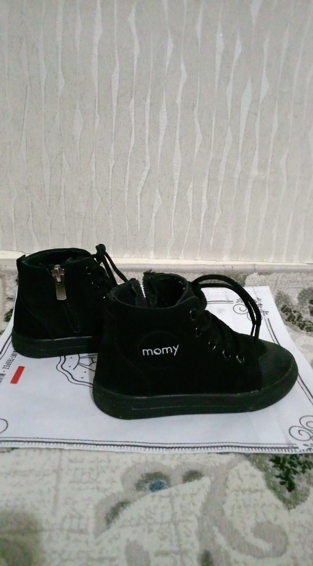 Siyah baskılı kauçuk erkek çocuk botları, kolay kullanım için fermuar önü bağlamalır ve normcore tarzındadır. Yanında 'momy' yazısı bulunur.