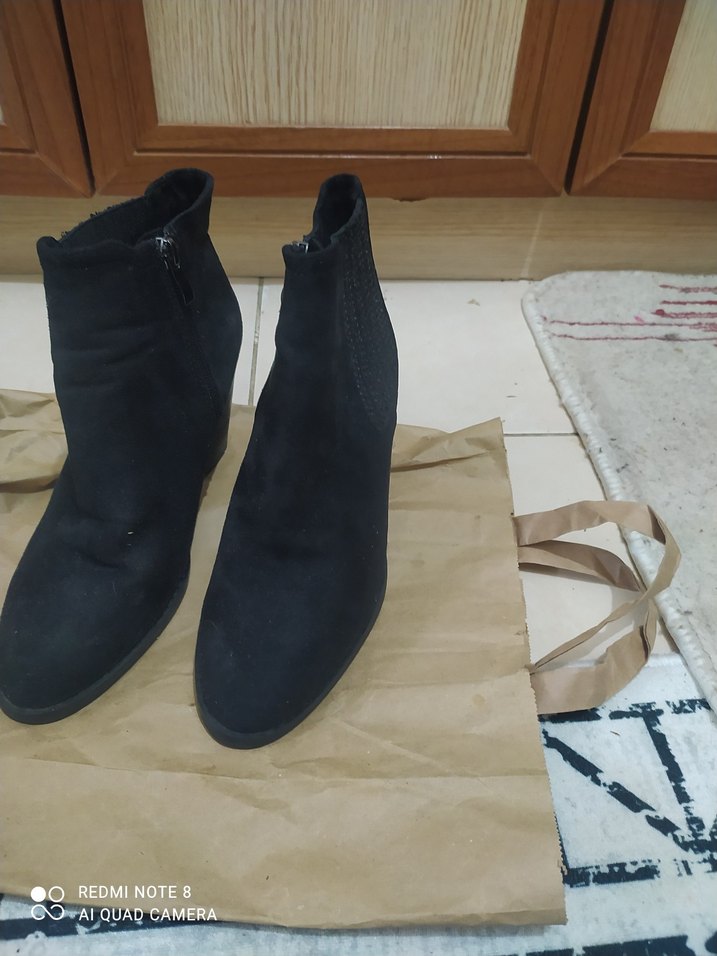 Dolgu topuklu, tokalı siyah süet kadın botları, minimalist ve normcore tarzına uygun. Günlük kullanıma uygundur.