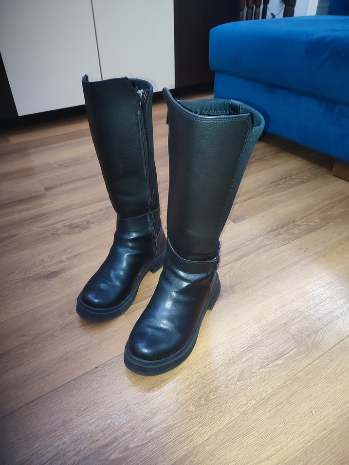 Siyah deri dizüstü botlar, blok topuklu ve tokalı, gotik tarzda, trend günlük kullanıma uygun.