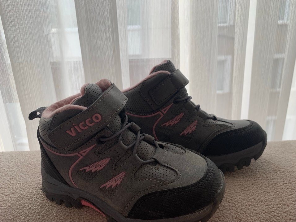 Kız çocukları için pembe ve gri renkli, baskılı biker tarzı spor ayakkabılar, cırt cırtlı ve kauçuk tabanlıdır.