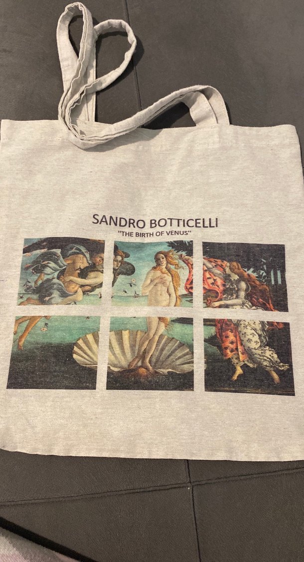 Beyaz renkli, Sandro Botticelli esintili baskılı kumaş çanta. Hafif ve günlük kullanıma uygun rahat bir tasarım. Sıfırdır orta boy bez çanta