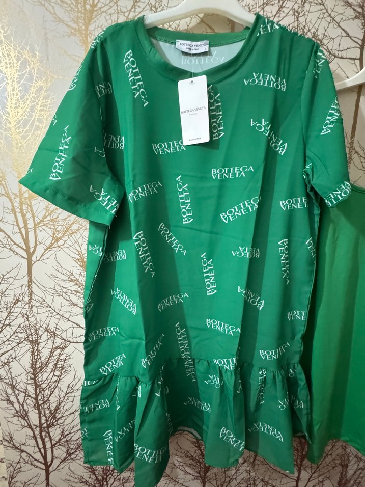 Yeşil baskılı mini elbise, kısa kollu ve bisiklet yaka. Sentetik kumaştan, bol kesim ve drapeli detaylara sahip.