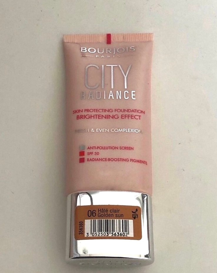 Bourjois City Radiance fondöten beige tonunda, aydınlatıcı etkili ve SPF 30 ile cildi korur. 06 Golden Sun rengi ve anti-pollution özelliği bulunur.