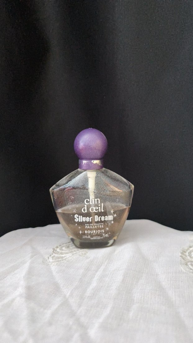 Bourjois Silver Dream kadın parfümü, mor kapaklı şık şişede, ışıltılı ve pırıltılı bir etkiye sahiptir. ✨