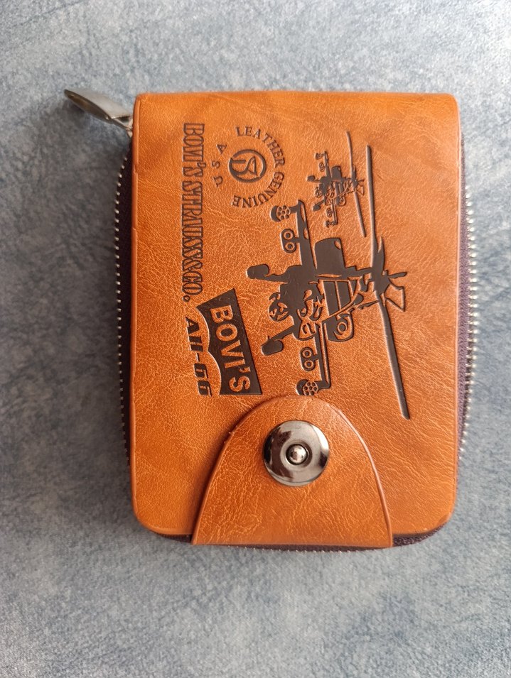 Kahverengi erkek cüzdanı, baskılı biker tarzı tasarım ve fermuarlı kapanışa sahiptir. Yumuşak deri görünümlü malzemeden üretilmiştir, önünde Bovi's markası bulunur. ️Hiç kullanılmadı hediye geldi sorunsuz