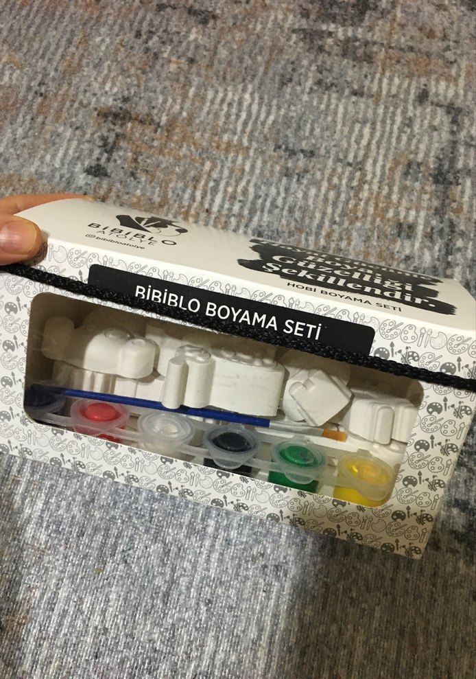 Ayıcık, traktör, kelebek ve tren gibi beyaz oyuncak figürler ile canlı renklerde boya ve fırça içeren set.