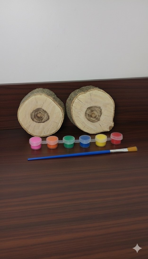 İki açık renkli ahşap dilim, altı canlı renkli boya kabı ve bir fırça içeren boyama seti.