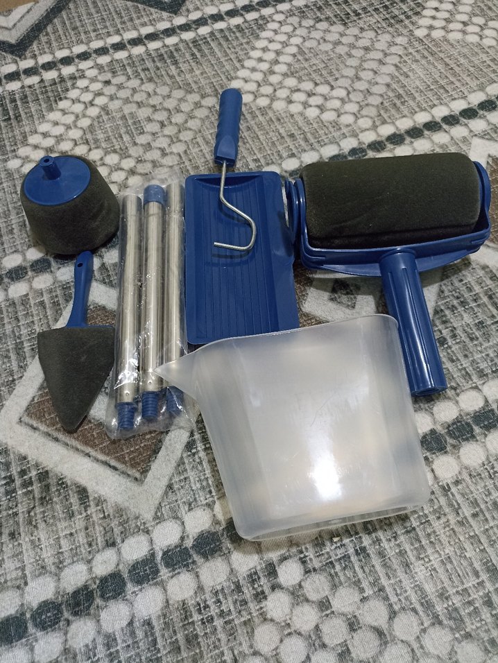 Boyama için rulo fırça, boya tepsisi, küçük fırça, uzatma çubukları ve ölçü kabı içeren set. Çeşitli boyama işleri için uygundur.