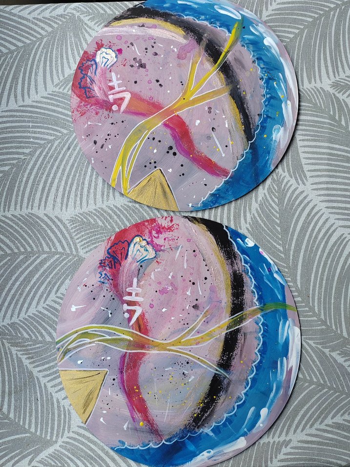 Soyut desenlere sahip, mavi, mor, pembe ve sarı renklerin karışımıyla renkli supla, supla yada duvar tabağı olarak kullanılabilir 2 adet