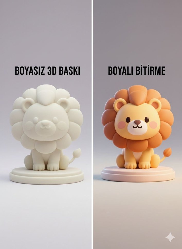 Açık kamel rengi aslan boyasız 3D baskı ve boyalı seçenekleriyle sunulur. Bebekler için güvenli ve sevimli.
