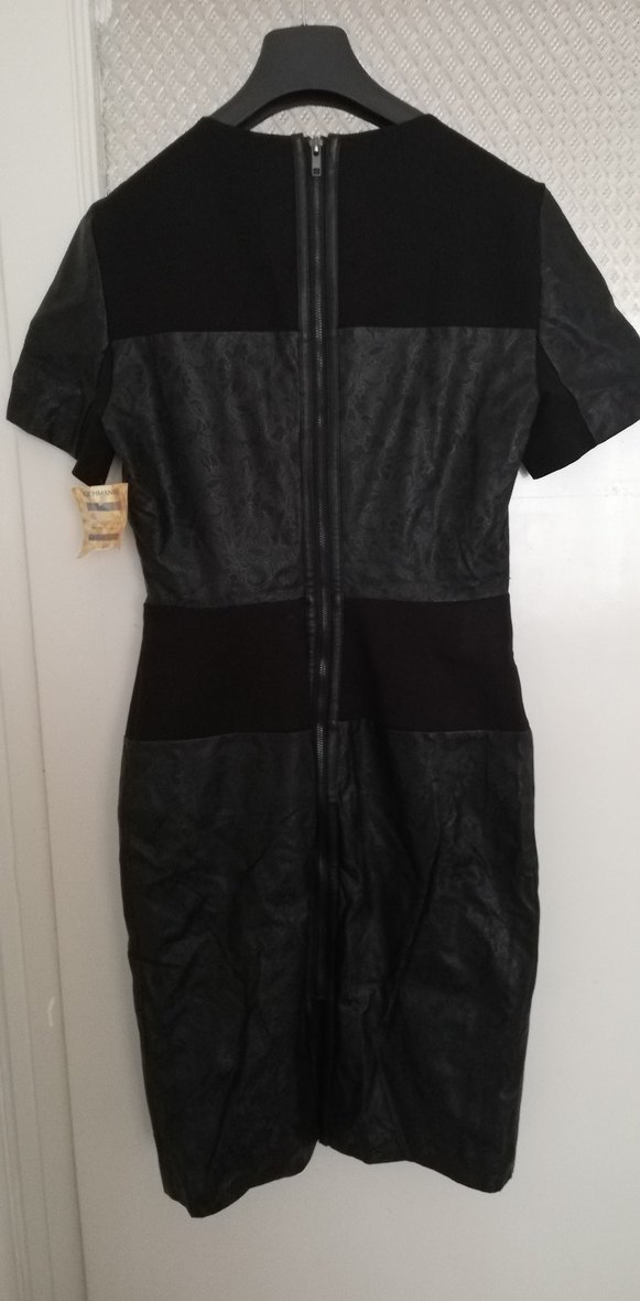 Boydan fermuarlı ,kısa kollu, bisiklet yaka ve siyah-gri tonlarında mini uzunlukta oturan elbise. Ofis için uygun şık gotik bir tarz sunar. karın kısmında aşınma var
