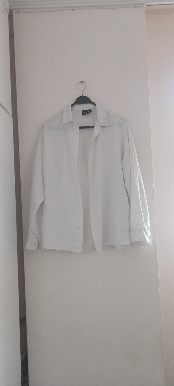 Beyaz keten görünümlü gömlek, uzun kollu ve yaka detaylıdır.oversize görünümlü