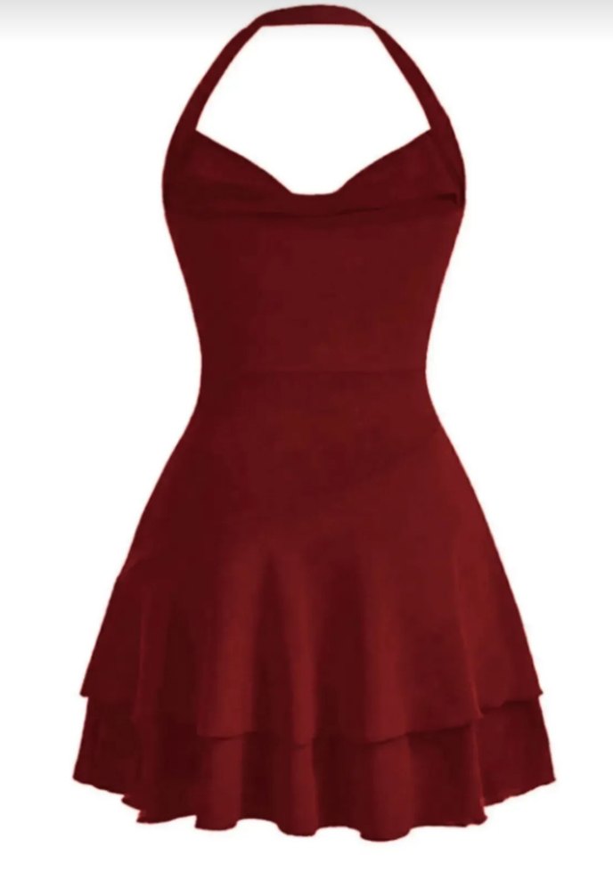 Bordo renkli, V yakalı ve kolsuz bu fitted midi elbise, fırfır detaylarıyla dikkat çeker. Akışkan sentetik kumaşı ve vintage goth tarzıyla romantik akşamlar için uygundur.