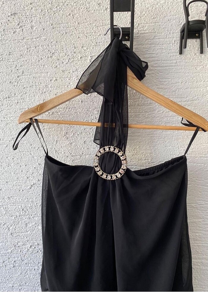 Boyundan bağlamalı taş broş detaylı kısa elbise. Lastikli yapısı olup straplez kısmı genişleyip daralır. Doridorca markasıdır. Sadece 1 kez kullanılmıştır