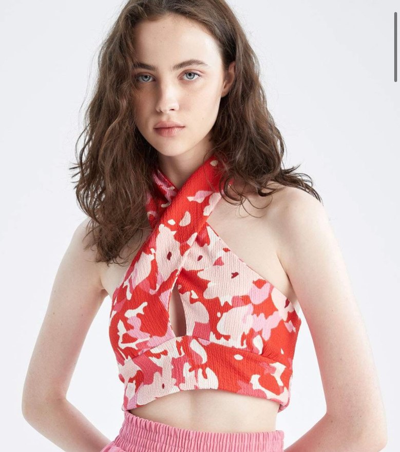 Boyundan bağlamalı yazlık crop top Kadınlar için, pastel kırmızı tie-dye desenli, drapeli V yakalı ve kolsuz, kısa kesim crop top. Hafif sentetik kumaştan yapılmıştır.