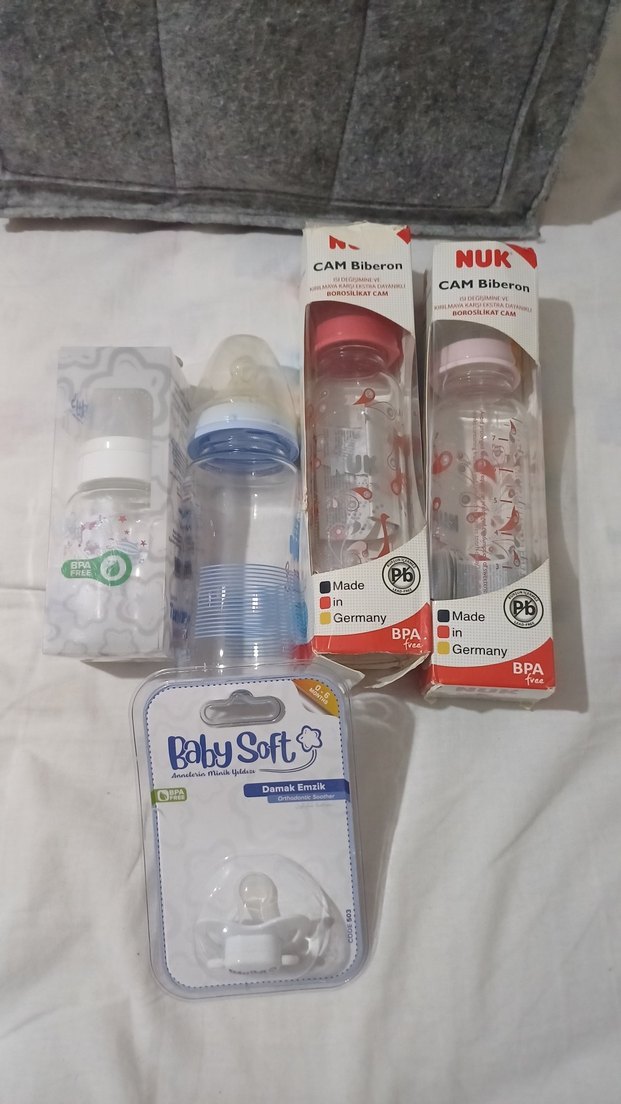 Almanya'da üretilmiş, BPA içermeyen beyaz bebek biberonları ve emzik seti. Yumuşak damak emziği dahildir. sıfır hepsi nuk markalılar emzik hediyemdir