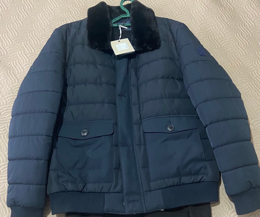 Kürk detaylı, lacivert renkte,XXL dar kalıp. Sıfır etiketli.Etikette 7 bin.