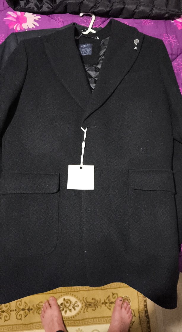 Düğmeli, siyah erkek kaban, kesik yaka ve uzun kollu. Orta boy ve rahat kesim, yumuşak ve sıcak kumaştan üretilmiştir. Ofis kullanımı için uygundur.