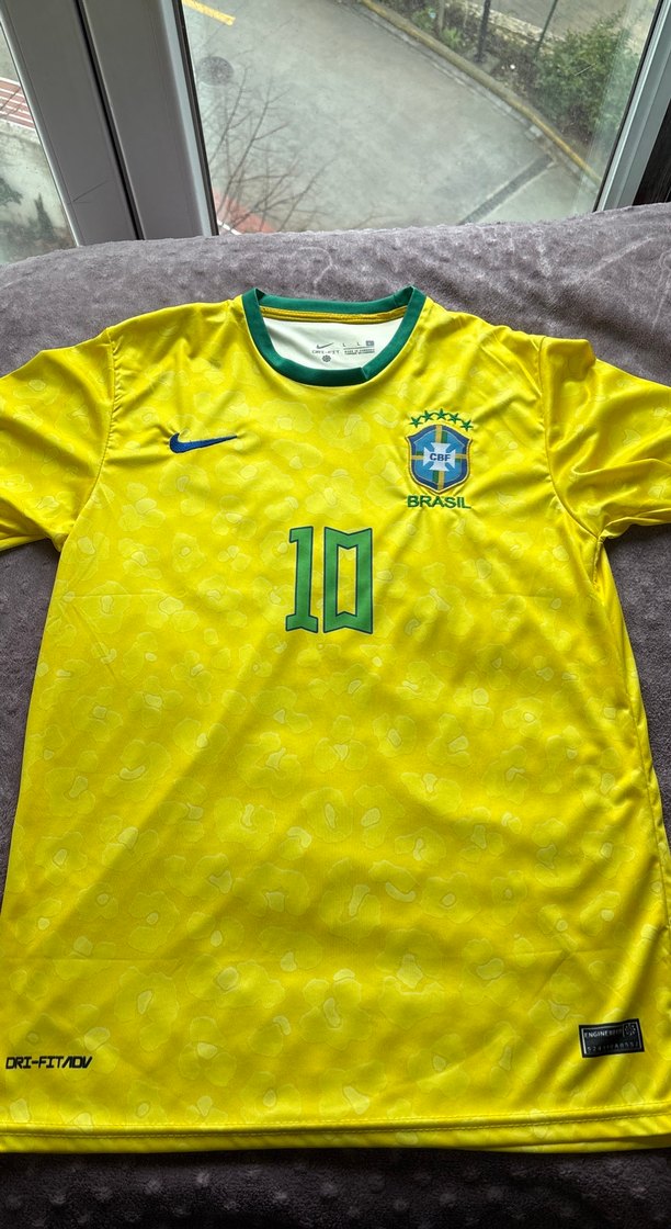 Sarı renkli, kısa kollu, bisiklet yaka ve dar kesim erkek spor forması. Baskılı desenli ve düğmeli detaylı, sentetik kumaştan üretilmiştir. Önünde 10 numara ve Brezilya amblemi bulunur. ⚽ sıfır gibi 14-15 yas ideal