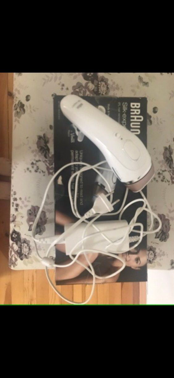 Braun beyaz lazer epilasyon cihazı, şık tasarıma sahip ve güç adaptörü ile birlikte gelir. Kişisel tüy alma için uygundur. ⚡