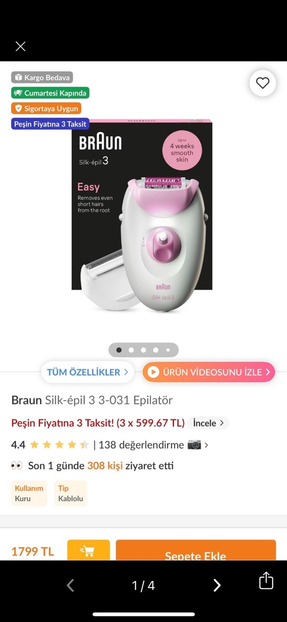 Braun Silk-épil 3-031 pembe renkli, kablolu ve kuru kullanım için uygun bir epilatördür. Kısa tüyleri kökünden alarak 4 haftaya kadar pürüzsüz cilt sağlar. 138 değerlendirmede 4,4 yıldız almıştır. ✨